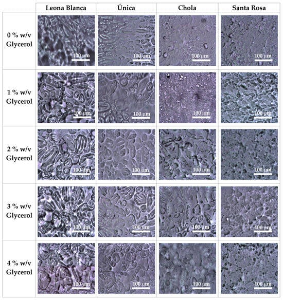 Figure 5. A comparison of topographies in various areas of the biofilms formed from starch from each analyzed variety is presented. All biofilms without glycerol exhibited a granular morphology, probably caused by the presence of spherical or oval granules derived from the starch used in their production [