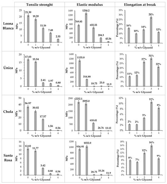 Mechanical tests performed showed that as the percentage of glycerol increases, the tensile strength decreases, and elongation at break increases. This could correlate to the topographical conformations observed at the nanoscale, since films generated from starch from all varieties exhibit a predominantly granular structure without glycerol, which diminishes to some extent when plasticizer concentration is increased.