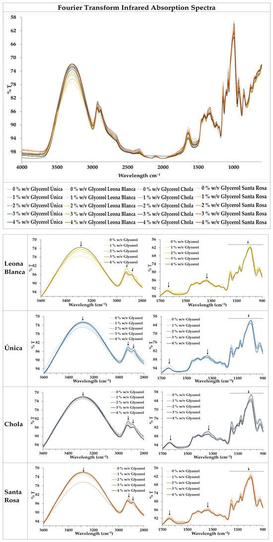 TSM results were found to follow the same trend as the MC. Considering both measurements, a higher percentage of glycerol seems to be related to a greater solubility of the generated films, although TSM values might be affected by glycerol release, too. Biofilms obtained from starch from Leona Blanca have lower values up to 3% w/v glycerol, but at 4% w/v glycerol TSM is slightly higher than in the Chola and Única cases. Additionally, it can be observed that biofilms obtained from starch extracted from Santa Rosa type are more soluble in water than other varieties, maybe due to the plasticizer interaction.