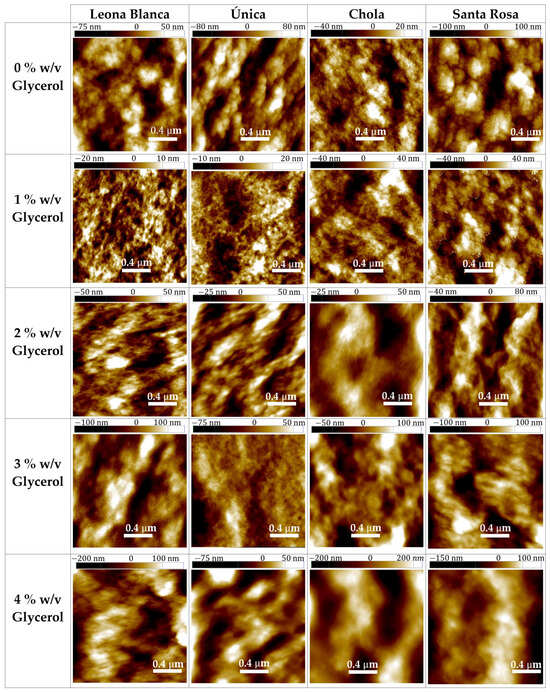 Chola case, corrugation shows a negligible change after glycerol inclusion. Beyond this first step, the surfaces of all samples seem to become smoother at the nanoscale if this plasticizer’s concentration increases, but more irregularities at the microscale appear, showing prominences of flat sides. This might also allow a better understanding of opacity results at high glycerol concentrations, since microscopic height variability could enhance optical diffusion at their surfaces more than if these imperfections were nanoscopic and irregularly distributed. A roughness analysis was performed on each image recorded, which corroborates the observation. The following parameters were calculated: the average roughness between the profile and its mean surface or Ra (