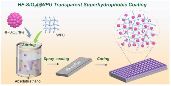 The bare glass substrate was cleaned with absolute ethanol before usage. HF-SiO2 nanoparticles with a total mass of 0.15 g were dispersed in 5 mL absolute ethanol under constant stirring for 30 min at room temperature (298 K) to obtain a uniform suspension, designated suspension A. A mass of 0.15 g WPU was dissolved in 5 mL absolute ethanol and magnetically stirred for 30 min at room temperature (298 K) to obtain suspension B. Then, suspension A and suspension B were mixed under magnetic stirring for 30 min at room temperature (298 K) to obtain the HF-SiO2@WPU suspension. The uniform HF-SiO2@WPU suspension was sprayed onto the cleaned glass substrates under 0.18 MPa air pressure. The distance between the glass substrates and the spray gun was ~15 cm. The spray-coated substrate was cured at 120 °C for 1 h to produce the testing sample. A schematic illustration of the fabrication of the HF-SiO2@WPU transparent superhydrophobic coating is shown in Figure 1.