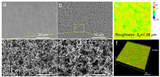 SEM images of the (a) bare glass and (b–d) prepared HF-SiO2@WPU superhydrophobic coating under different magnifications; (e,f) 2D and 3D LSCM images of the fabricated HF-SiO2@WPU superhydrophobic coating.