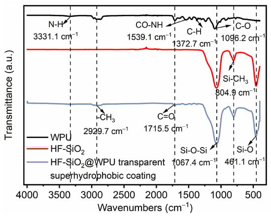 FTIR spectra were employed to investigate the chemical groups of WPU, HF-SiO2, and HF-SiO2@WPU superhydrophobic coating, as shown in Figure 4. The absorption peaks at 2929.7 cm−1 and 1715.5 cm−1 can be attributed to the stretching vibrations of -CH3 and C=O groups. In addition, the absorption peak around 1067.4 cm−1 could be assigned to the vibration peaks of Si-O-Si bonds. The peak appearing at 804.9 cm−1 was attributed to the rocking of CH3 in Si-CH3, and the peak at 461.1 cm−1 corresponded to the symmetric vibration peak of Si-O bond [,,]. All characteristic peaks in the FTIR spectra indicated the existence of WPU and HF-SiO2 nanoparticles, which were conductive to improving the roughness and superhydrophobicity of coatings.
