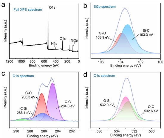 To further confirm the elemental composition of the HF-SiO2@WPU superhydrophobic coating, X-ray photoelectron spectroscopy (XPS) was used to conform its surface elements. The full XPS spectrum of the HF-SiO2@WPU superhydrophobic coating was shown in Figure 5a. The HF-SiO2@WPU superhydrophobic coating has four main peaks, including O1s (532.5 eV), N1s (399.3 eV), C1s (284.8 eV), and Si2p (103.2 eV), respectively. Figure 5b–d show the high-resolution Si2p, C1s, and O1s spectra of the HF-SiO2@WPU superhydrophobic coating. The C1s spectrum has three peaks with binding energies of 284.8 eV, 286.1 eV, and 286.3 eV, corresponding to C-C, C-Si, and C-O, respectively. For the Si2p spectrum, two peaks at 103.9 eV and 103.3 eV can be assigned to Si-O and Si-C. The O1s spectrum can be fitted to O-Si and O-C peaks, located at 532.9 eV and 532.6 eV, respectively.