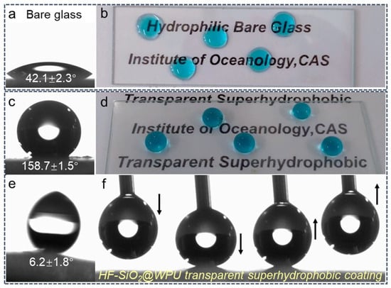 Figure 6a shows a contact angle diagram of the bare glass substrate, with a WCA of 42.1 ± 2.3°. Figure 6b shows an optical photograph of dyed water droplets on the surface of a bare microscope slide. The droplets exhibited a Wenzel wetting state on the surface, indicating that the untreated glass substrate is intrinsically hydrophilic. Figure 6c,d show the CA and images of water droplet placed on the HF-SiO2@WPU superhydrophobic coating, with a WCA of 158.7 ± 1.5°. On the coated glass surface, the dyed water droplets displayed typical spherical contours, demonstrating a unique Cassie–Baxter non-wetting state, ultra-low liquid–solid contact area, and excellent superhydrophobic properties. Additionally, it could be observed that the coated HF-SiO2@WPU superhydrophobic surface presented high transparency. The letters under the coated glass substrate could be easily seen. Figure 6e,f presents the SA and dynamic contact behavior of a water droplet. The SA of the prepared HF-SiO2@WPU transparent superhydrophobic coating was 6.2 ± 1.8°. In the dynamic contact testing between the water droplet and the coating surface, we fixed the substrate stage and gradually approached it with a water droplet from a microsyringe. As the droplet contacted the surface, compressed against it, and detached from it, it was observed that the droplet could easily detach from the prepared surface covered with the HF-SiO2@WPU transparent superhydrophobic coating without leaving any residual liquid. This indicates that the prepared transparent superhydrophobic coating has extremely low surface energy and reduced interfacial liquid adhesion force, mainly due to the introduction of micro-/nanostructures and low-surface-energy characteristics brought by the HF-SiO2 particles.