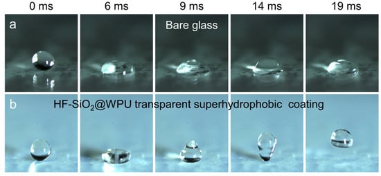 Figure 7a,b depict images captured by a high-speed camera studying the impact of water droplets on both the bare glass and the glass substrate covered with the coating. For the bare glass substrate, the water droplet exhibited pinning and adhesion upon contact with the surface, displaying a hydrophilic state. In contrast, when the water droplet contacted the surface of the HF-SiO2@WPU superhydrophobic coating, it underwent compression, deformation, and bouncing due to the interaction. The solid–liquid contact time was only 14 ms, and the extremely short solid–liquid contact area further demonstrated the excellent superhydrophobic properties of the surface, allowing the water droplet to quickly bounce off the surface after brief contact, leaving no liquid residue. This outstanding superhydrophobic property is mainly attributed to the micro/nano binary hierarchical structure of the HF-SiO2@WPU coating surface and the low surface energy of HF-SiO2.