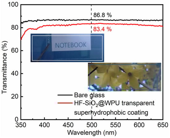 Figure 8 shows the comparison of the light transmittance data between the bare glass substrate and the prepared HF-SiO2@WPU superhydrophobic coating. It can be seen from the figure that the light transmittance of the bare glass substrate was 86.8% (wavelength: 500 nm), while the light transmittance of the HF-SiO2@WPU superhydrophobic coating was 83.4% (wavelength: 500 nm). By calculating the ratio of the transmittance of the coating to the transmittance of the bare glass substrate, it can be concluded that the light transmittance of the prepared HF-SiO2@WPU superhydrophobic coating can reach 96.1% of that of the bare glass substrate, fully confirming the extremely high light transmittance exhibited by the prepared coating. From the inset of Figure 8, it can also be observed that when observing the notebook and yellow flowers through the HF-SiO2@WPU superhydrophobic coating-treated microscope slide, the text on the notebook and the structural characteristics of the flowers could be clearly seen. This further confirms that the prepared transparent superhydrophobic coating exhibits extremely high light transmittance. This high light transmittance is mainly due to the very uniform and small-scale nanoporous network structure on the surface, as well as the relatively low thickness of the coating, which is conducive to light transmission. Reducing the thickness of superhydrophobic coatings, decreasing the scale of micro-/nanostructures, and other methods are effective ways to enhance the light transmittance of superhydrophobic coatings. Continuously improving the transparency of the surface while maintaining its superhydrophobic properties will also give this class of materials greater potential for applications in various fields. Additionally, research on the mechanical stability of transparent superhydrophobic coatings is currently receiving widespread attention, as this is also an important factor for transitioning these materials from laboratory design to practical applications.