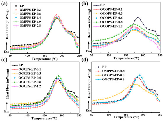 DSC curves of the OMPPS-EP-i (a), OCOPS-EP-j (b), and OGCPS-EP-k (c) hybrid resins. (d) The pristine epoxy resin and hybrid resins with the same load amount of modifier.