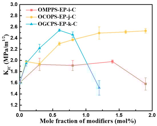 Fracture toughness refers to the ability of a material to prevent the unstable propagation of macro cracks, which can generally be represented by the critical stress intensity factor (KIC). The larger the KIC, the better the fracture toughness of the material. Figure 11 shows the KIC of OMPPS-EP-i-C, OCOPS-EP-j-C, and OGCPS-EP-k-C.