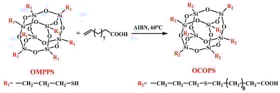 2.3. Synthesis of Octa (Carboxyl Decyl Thiopropyl) Polyhedral Oligomeric Silsesquioxane (OCOPS)