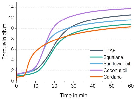 In addition, the minimum torque at the beginning of the measurement shows the influence of the different viscosities of the oils on the overall compound viscosity. Cardanol having the lowest molecular weight (302 g/mol) also results in the lowest minimum torque, while coconut (639 g/mol) and sunflower oil (881 g/mol) result in the highest minimum torques.