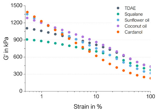 In general, the maximum torque is related to the CLD of the compound [20]. For sunflower oil and cardanol, the maximum torque values are much lower compared to TDAE, which can be explained by the low CLD values obtained for these compounds. The high maximum torque for coconut oil and the low maximum torque obtained for squalane can be partly explained by the differences in the CLD of these compounds compared to TDAE because the difference in CLD is only slight (Table 4). Therefore, it is likely that the difference in maximum torque between the compounds is influenced by other factors as well, for example, filler–filler interactions. This could indicate a better microdispersion for squalane and a worse dispersion for coconut oil compared to TDAE. Cured Payne effect measurements were performed to get insight into these filler–filler interactions.