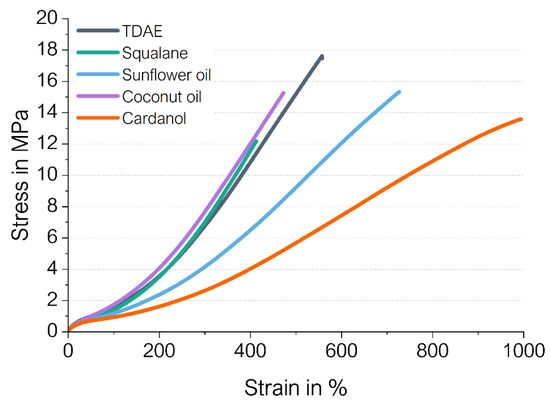 For all bio-based alternatives, the tensile strength decreases. Squalane shows a similar curve to TDAE, except for a much lower elongation at break and therefore tensile strength.