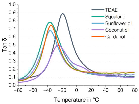 In the case of plasticizers, lower Tg values indicate less internal friction, which might be caused by an increased free volume in the material. Squalane, cardanol and sunflower oil have a lower softening point compared to coconut oil and TDAE (Table 1). Therefore, these alternatives are less viscous at low temperatures. It could be that these plasticizers are more mobile and easier to migrate to the free volume at low temperatures. Therefore, the Tg of the cardanol and sunflower oil is lower, compared to the coconut oil and TDAE. The shift of the tan δ peak of coconut oil is less severe than the other plasticizer alternatives. In addition, a shoulder can be observed for coconut oil between 0 and 20 °C. This can be explained by the poorer compatibility of the coconut oil with the used polymers compared to the other plasticizers. When materials are fully miscible, the blend will have one single Tg. In the case of immiscible blends, the Tg values of the separate components will not change, and two single peaks will be observed corresponding to each ingredient [25]. Table 1 shows that coconut oil has a lower total Hansen solubility parameter compared to TDAE, cardanol and sunflower oil. Therefore, coconut oil is potentially less compatible with the used polymers compared to the other plasticizers. Additionally, coconut oil has a higher softening temperature [26]. The second peak between 0 and 20 °C could be an indication of the softening behavior.