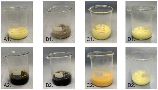 Sulfur mixed at RT with sunflower oil (A1), cardanol (B1), coconut oil (C1) and squalane (D1). Sulfur in sunflower oil (A2), cardanol (B2), coconut oil (C2) and squalane (D2) after mixing for 1 h at 160 °C.