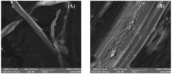 Photomicrographs of cellulose obtained by SEM. (A) 200× magnification. (B) 500× magnification.