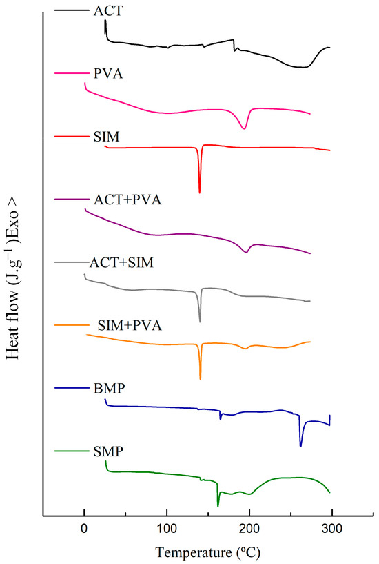 The DSC and TG/DTG curves of ACT, PVA, SIM, binary mixtures, and microparticles obtained can be observed in Figure 6 and Figure 7, respectively. Both additional TGA data for excipients and binary mixtures and DSC heating curves and temperature data can be found in Supplementary Material.