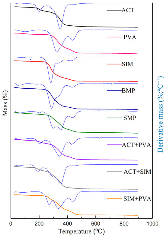 Simultaneous TGA/DTG thermograms of cellulose acetate (ACT), polyvinyl alcohol (PVA), simvastatin (SIM), the binary mixtures [cellulose acetate+polyvinyl alcohol (ACT+PVA), cellulose acetate+simvastatin (ACT+SIM), and simvastatin+polyvinyl alcohol (SIM+PVA)] and microparticles without the drug (BMP) and with simvastatin (SMP).