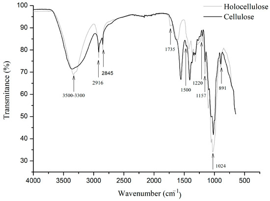 FTIR spectrum for holocellulose and cellulose.