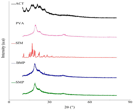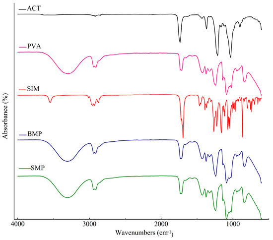 The absorption spectra in the infrared region of ACT, PVA, SIM, and microparticles are shown in Figure 9. Moreover, Table 2 presents the assignments of the main bands regarding the absorption spectra.