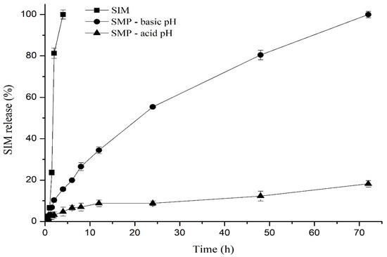 The in vitro release test assesses the ability of the system to release the encapsulated drug, offering an indication of the system’s behavior [67]. Although this kind of study is only a premise for understanding the SMP performance, it was considered an adequate method to highlight the importance of the microparticle components and their microstructure in the SIM release through artificial membranes. This finding underscores the potential of the developed formulation as a promising system for controlled SIM release, which can lead to an improvement in the bioavailability of the drug and patient adherence to treatment.