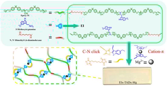 The following supporting information can be downloaded at: https://www.mdpi.com/article/10.3390/polym16131900/s1, Table S1: The detailed receipt of EIx.; Figure S1: FT-IR spectrum of E51; Figure S2. FT-IR spectra of EI25-TAD5-Mg; Figure S3: 1H NMR spectrum of Hexamethylene Bis-Semicarbazides; Figure S4: 1H NMR spectrum of Hexamethylene Bis-Urazole; Figure S5: 1H NMR spectrum of Hexamethylene Bis-Triazolinedione (TAD).