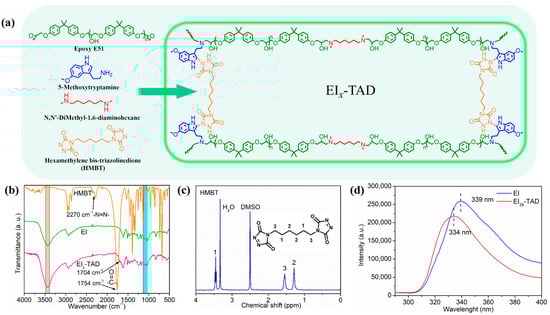 (a) Synthesis of EIx-TAD. (b) FT-IR spectrum of HMBT, EI, and EIx-TAD. (c) 1H NMR spectrum of HMBT. (d) Fluorescence spectrum of uncrosslinked and crosslinked films.