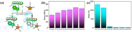 (a) Schematic diagram of chemical click site. (b) Tensile strength and (c) toughness curves of EIx-TAD.