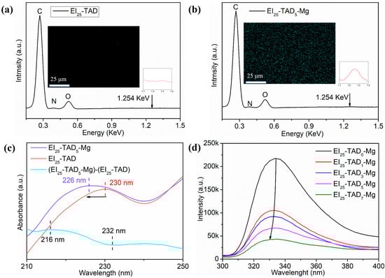 (a) EDS and mapping of EI25-TAD. (b) EDS and mapping of EI25-TAD5-Mg. (c) UV–Vis spectrum of EI25-TAD, and EI25-TAD5-Mg, and the difference spectrum between EI25-TAD5-Mg and EI25-TAD. (d) Fluorescence spectrum of EI25-TADx-Mg.