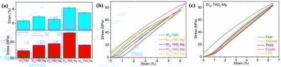 (a) The tensile properties of EI25-TADx-Mg. (b) The cyclic strain–stress curves of EI25-TADx-Mg. (c) The cyclic stress–strain curves of EI25-TAD5-Mg with five cycles.