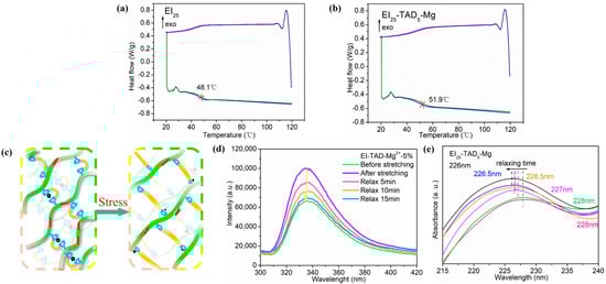 The second and third heating DSC curves for (a) EI25-TAD5-Mg and (b) EI25-TAD. (c) Schematic diagram of the film under external force. (d) In situ tensile-fluorescence mapping of EI25-TAD5-Mg. (e) In situ tensile-UV mapping of EI25-TAD5-Mg.