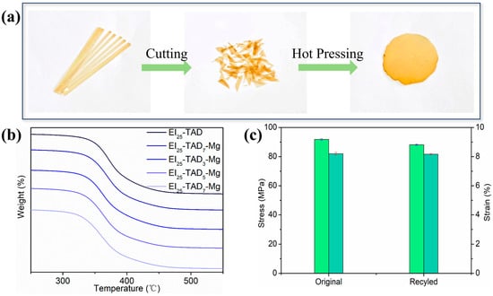(a) Process of hot pressing. (b) TGA curves of EI25-TADx-Mg. (c) Stress–strain curves of original and remodeling EI25-TAD5-Mg sample.