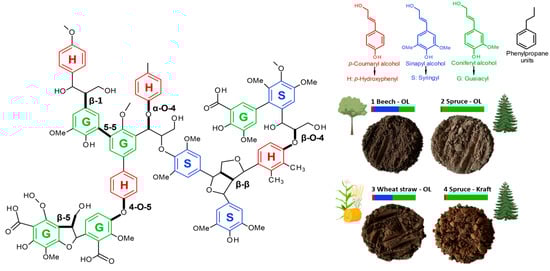 Lignin chemical structure with the main linkages and the proportion of different monolignols and monomeric units (G, S, and H) according to the biomass source. Photographs of the organosolv (OL)-extracted lignin’s with beech (1), spruce (2), and wheat straw (3). Comparison with kraft lignin (KL) from spruce (4).