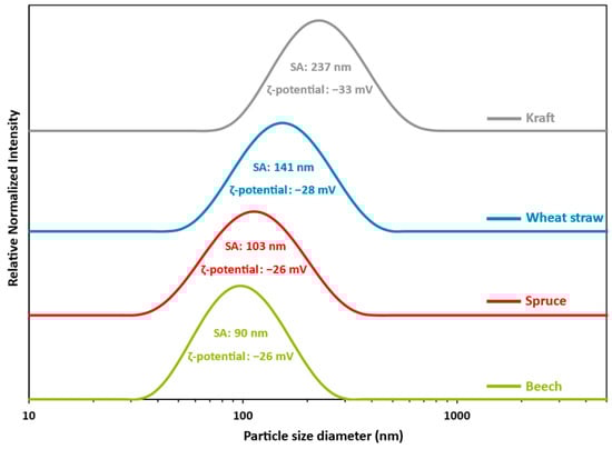The size distribution, average size, and ζ-potential of LNPs suspensions obtained according to the manufacturing process described above were analyzed using a Malvern™ Zetasizer, as shown in Figure 2. Nanosized, monomodal, and size distributions that are quite large were observed in all cases. The mean size of the particles calculated in terms of scattered intensity decreases in the order kraft > wheat straw > spruce > beech lignin. The mean sizes of particles obtained from beech, spruce, and wheat straw are similar, while particles obtained from kraft lignin are much larger (mean size of 198 nm). The results in Figure 2 support the theory that LNPs formation mechanisms are partly driven by lignin chemical structure interactions [,,,] since the chemical compositions of lignin molecules extracted from beech, spruce, and wheat straw have more similarities between them than kraft. This highlights the crucial importance of selecting the appropriate biomass for further processing and application. However, the distribution and mean particle size of beech, spruce, and wheat straw do not fall below the limit value of 45 nm defined by Filon et al. [] with respect to potential skin penetration, providing no restrictions for cosmetic applications. Figure 2 also shows the ζ-potential of the LNPs suspensions. The results revealed a highly negative ζ-potential with respect to all suspensions (−26 to −33 mV), which favors maintaining self-repulsion and electrostatic stability over time. This is confirmed by the very low variation of the particle mean sizes after 90 days of storage at 4 °C (size variation between 3 and 10%).