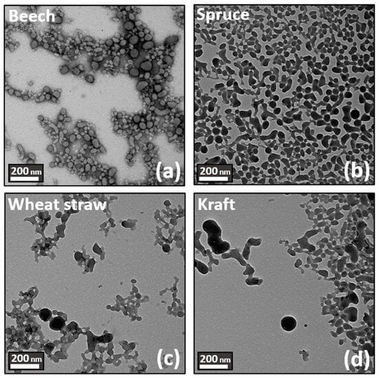TEM microscopic observations in Figure 3 were used to complete the characterization of LNPs. First, TEM images confirm the DLS measurements for each lignin source. Nevertheless, while particles from beech feedstock appeared to be spherical and isotropic, particles from other feedstocks seem to present irregular shapes, as well as anisotropy characterized by a dense core enveloped in a fluffy outer wreath. Finally, it can be observed that Kraft lignin has the most irregular shape and the highest anisotropy.