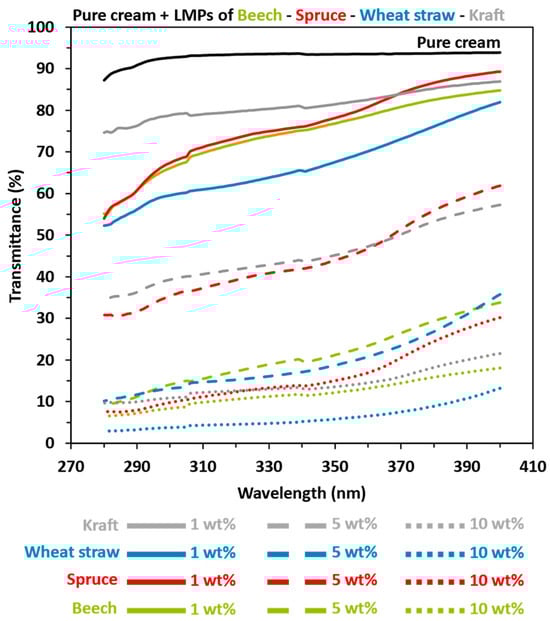 Then, Figure 4 confirms the former results from the literature [,,,,,,], with a decrease in UV transmittance linked to an increase in SPF values when LMPs were added to pure cream, regardless of the lignin type or biomass feedstock. The SPF values of the 1 wt% LMPs-based pure cream ranged from 1.27 to 1.66, with lower transmittance in both UVA and UVB areas for organosolv–wheat straw lignin (OWS). A substantial gap was observed with respect to 5 wt% of LMPs concerning kraft and organosolv–spruce (OS) compared to organosolv–beech (OB) and wheat straw lignins (SPF values from 2.51 and 7.33). Indeed, the results from 5 wt% LMPs-based OWS and OB pure cream were practically equivalent to kraft and OS 10 wt%. For the 10 wt% amount, OWS stands out from other preparations with an SPF of 25.30 compared to 11.24, 9.65, and 8.85 for OB, OS, and kraft lignin, respectively.