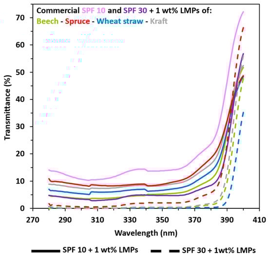 Currently, if the brown characteristic color of lignin is still a problem, the solution may lie in the use of this natural organic filter as a complement to current filters in order to reduce their proportions. Therefore, the enhancement of commercial SPF 10 and SPF 30 sunscreens with LMPs was also studied. Results in Figure 5 and Figure S2 indicate that LMPs improve both commercial SPF 10 and SPF 30 sunscreens. The same trends were observed, with hardwood and herbaceous LMPs exhibiting better UV-shielding properties with the transmittance of SPF 10 + 1 wt%, closely matching commercial SPF 30 sunscreens (SPF values of 18.29 and 27.43). For softwood LMPs, even at 5 wt% concentration, the transmittance of SPF 10 corresponds to the SPF 30 sunscreen (SPF values of 22.65 and 26.17). In the case of adding 1 wt% of LMPs in the commercial SPF 30 lotion, the total UV-shielding transmittance value was close to 0 and exhibited highly related SPF values (SPF > 100, but it was indexed at 50+ for a concrete meaning).