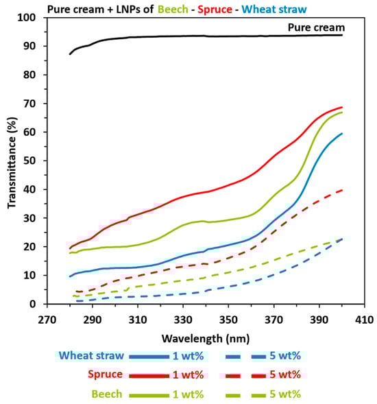 UV transmittance results in UVA and UVB areas of pure cream (NIVEA® Soft) mixed with 1 or 5 wt% lignin nanoparticles (LNPs). Black: pure cream. Green: beech. Red: spruce. Blue: wheat straw. Solid line: 1 LNPs wt%. Coarse dotted line: 5 wt% LNPs.