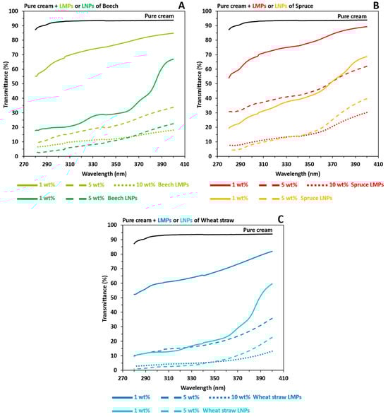 UV transmittance results in the UVA and UVB areas of pure cream (NIVEA® Soft) mixed with the macroparticles (LMPs) or nanoparticles (LNPs) of extracted organosolv lignins. Black: pure cream. (A) Beech LMPs or LNPs. Light green: LMPs. Dark green: LNPs. (B) Spruce LMPs or LNPs. Red: LMPs. Orange: LNPs. (C) Wheat straw LMPs or LNPs. Dark blue: LMPs. Light blue: LNPs. For (A–C), solid line: 1 LNPs wt%. Coarse dotted line: 5 wt% LNPs.