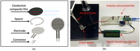(a) The schematic image of commercial force sensor components and (b) the instrument setup for sensor signal characterization.