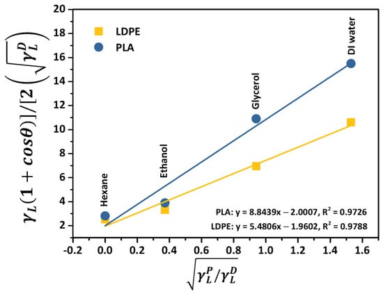 From Equation (4), after plotting the surface tension () of the corresponding liquid acquired from the liquid’s surface tension reported in Table 2 versus the cosine term of the measured contact angle of individual solvents ([), the slope of the linear function fitted through each data point represents the polar part of the solid’s surface energy, as illustrated in Figure 2. The extrapolation points to the y-intercept, using a linear regression line, refers to the dispersive component of the solid’s surface energy. It can be seen that the notable linearity of the plot with an R2 value of 0.9726 and 0.9788 indicated a precise determination of the dispersive surface energy of the PLA and LDPE specimens that relied on the OWRK model.