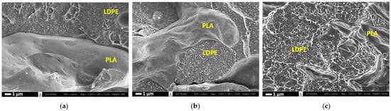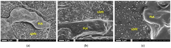 In this study, interest was focused on the immiscible blend of polylactic acid (PLA) and low-density polyethylene (LDPE). LDPE is chosen for its favorable physical properties, including high elongation at break, high impact strength, chemical inertness, low cost, and low density [26,27]. Previous research has shown that the PLA/LDPE blend can form an in situ fiber-reinforced composite at a relatively low PLA loading of 10 wt% [28]. This in situ fiber reinforcement is primarily attributed to the viscosity ratio of the blend being around 1, facilitating favorable in situ fiber formation. Other studies have reported that a co-continuous structure can be formed as the PLA content increases. Djellali, S. et al. [27] found that PLA/LDPE blends with ratios of 60/40 and 40/60 exhibited a dispersed LDPE phase in the continuous phase of PLA, and vice versa, while a 50/50 PLA/LDPE blend had a co-continuous morphology without a phase-in-phase structure. Similar co-continuous blend morphologies have also been observed in 50/50 wt% blends of PLA with linear low-density polyethylene (LLDPE) [29] and high-density polyethylene (HDPE) [30] systems.
