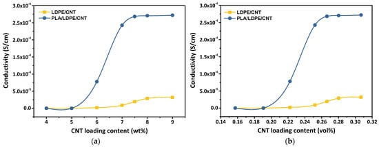 Electrical conductivity of the CNT/LDPE and CNT/PLA/LDPE composites with different CNT loading contents expressed by (a) weight fraction (wt%) and (b) volume fraction (vol%).