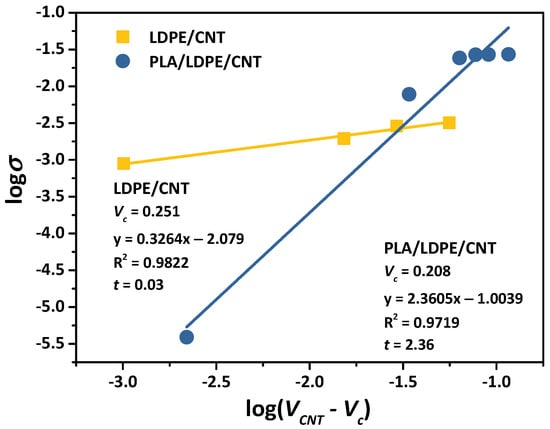 A plot of log versus log() of LDPE/CNT and PLA/LDPE/CNT composites. The Vc was varied until the best linear fit and the critical exponent (t) were reported.