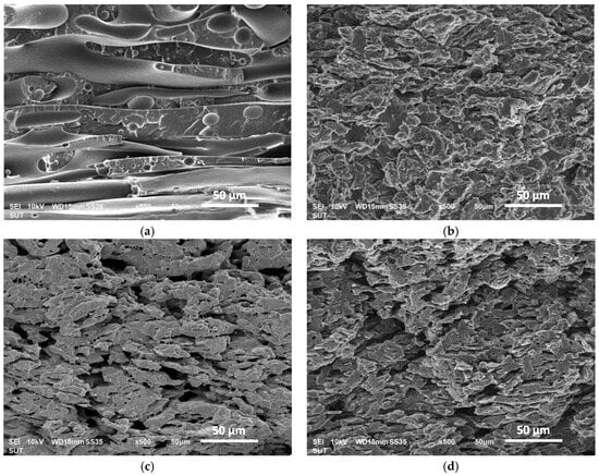 In a thermodynamic equilibrium state, the specific interactions between CNTs and each component in the composites contribute to the final distribution of CNTs [22,23,24]. Consequently, it is anticipated that the CNTs may be located within either PLA or LDPE or at the interface between the two immiscible polymers. The correlation between surface tension and final distribution of CNTs can be predicted by calculating the wetting coefficient () in the following Equation (1) [14].