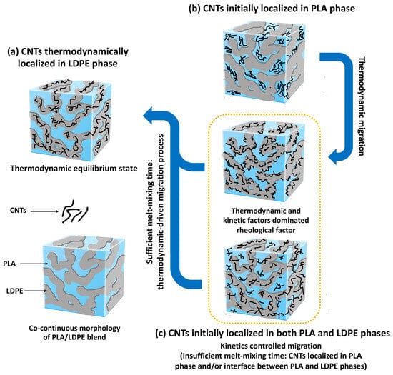 In our case, during melt-mixing, PLA and LDPE underwent fusion and exhibited characteristics of immiscible fluids, whereas the CNTs remained in a solid state throughout the complete melting of the polymers. In this state, the CNTs were wet through the liquid–solid interface with the polymer melt. The motivation for the thermodynamic migration of CNTs lay in the favorable interaction between CNTs and LDPE much more than between CNTs and PLA. Although PLA has lower melt-viscosity to that of LDPE, the migration of CNTs to the higher melt-viscosity LDPE component was evidenced. Therefore, the CNTs localized in the LDPE phase were predominantly driven by thermodynamic dominance rather than rheological factor.
