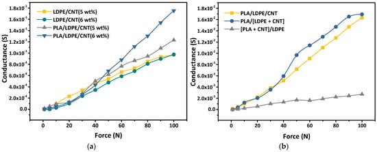 Figure 11a displays the relationships between conductance and applied force of LDPE/CNT and PLA/LDPE/CNT composites with the CNT loading contents of 5–6 wt%, ranging between lower and higher percolation threshold of PLA/LDPE/CNT composites (5.56 wt%). In LDPE/CNT composites, the conductance exhibited nearly linear growth with increasing applied forces and remained independent of the CNT loading contents. Despite the CNT loading being below the percolation threshold (6.95 wt% for LDPE/CNT composite), the application of applied force led to the formation of conductive paths. This was attributed to the reduced inter-CNT distance facilitating electron transfer. A similar trend was observed in the PLA/LDPE/CNT composite with a 5 wt% CNT loading approaching its percolation threshold, but its conductance surpassed that of LDPE/CNT composites. Consequently, a greater number of conductive paths could be formed resulting in higher conductance. In contrast, the PLA/LDPE/CNT composite with a 6 wt% CNT loading content beyond its percolation threshold showed the highest conductance among them. This could be attributed to the electrical responses under the applied force that were related to the electrical conductivity of the PLA/LDPE/CNT composites. However, the conductance of all samples had less sensitivity when the applied forces were lower than 20 N.