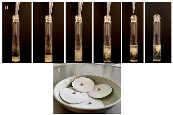 A culture of M. hirsuta containing around 62% w w−1 of PHB was used for this test. During the extraction with 1,3-dioxolane, thanks to the solvent’s properties, the precipitated solid remained in the upper fraction of the solvent/anti-solvent mixture. The subsequent addition of water caused the formation of a swollen white polymer. This phenomenon was previously observed during the extraction of PHAs with 1,3-dioxolane and confirmed in this study [15]. The solid was washed with MilliQ water and left overnight on filter paper at room temperature. The biopolymer precipitated and dried is shown in Figure 2a and Figure 2b, respectively.