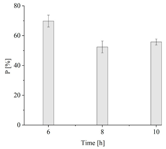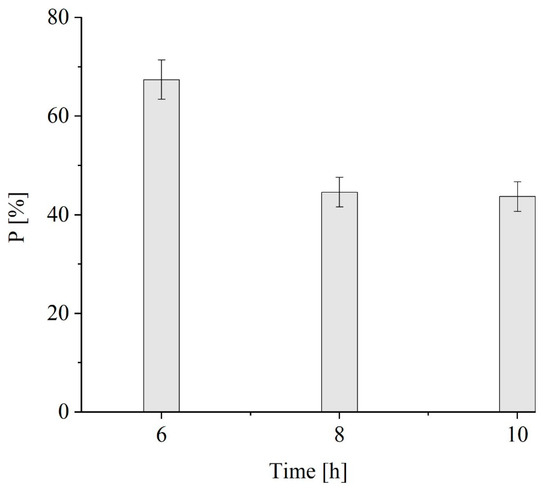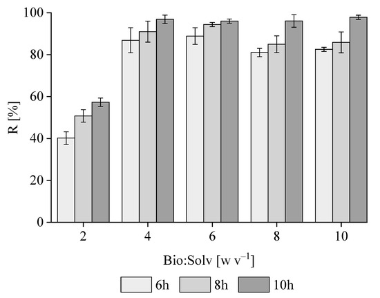 According to Figure 3, for all Bio/Solv ratios (w v−1), the recovery of PHB from M. hirsuta biomass increased with contact time, reaching a maximum value of ≈96% w w−1 at ratios of 4, 6, 8 and 10 at a time of 10 h. This behavior was consistent with previous findings, which demonstrated that extending the time cycle increases extraction yields [37]. Lower but similar results were obtained at 6 and 8 h, corresponding, respectively, to ≈87 ± 5.9% w w−1 and 91 ± 5.1% w w−1 at a biomass-to-solvent ratio of 4 and 89 ± 4.2% w w−1 and 94 ± 1.3% w w−1 at a ratio of 6. These results were similar to those reported for sodium hypochlorite, ethylene carbonate and chloroform, with values of 86, 98.6 and 99%, respectively, but were higher when compared to other green solvents such as dimethyl carbonate, acetone or ethanol, with values ranging from 70 to 80% [38]. Therefore, the biomass-to-solvent ratio was set at 6, based on the empirical solvent consumption and final recovery yields herein obtained. In this context, the extraction time determines the sizing of the plant and its CAPEX, which ultimately governs its widespread implementation at an industrial scale.