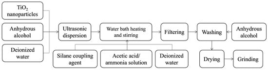 Raw materials for the preparation of modified titania nanoparticles included commercially sourced high-purity powder and chemical reagents, such as rutile titania powder (100 nm) (AR, Hangzhou Hengna New Material Co., Ltd., Hangzhou, China), anhydrous ethanol, acetic acid, deionized water (AR, Shanghai Aladdin Biochemical Technology Co., Ltd., Shanghai, China) and silane coupling agents (γ-amino propyl triethoxy silane, γ-(2,3-epoxy propoxy) propyl trimethoxy silane and γ-methacryloxy propyl trimethoxy silane) (AR, Hangzhou Jessica Chemicals Co., Ltd., Hangzhou, China).